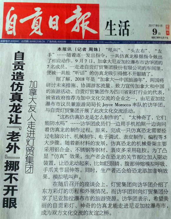 為進一步擴大中加雙方經(jīng)貿(mào)往來和人文交往,推進“2018中加旅游年”的交流合作。受四川省人民政府邀請,尼亞加拉瀑布市政府訪問團一行7人于9月7日-9日到自貢燈貿(mào)集團、四川藝思特彩燈文化傳播有限公司進行訪問考察。