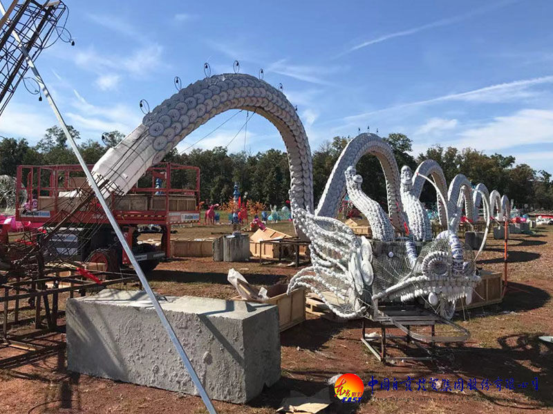 《中華瓷龍》燈組最具有文化代表性,龍是中華民族的圖騰,被賦予了強(qiáng)烈的漢民族人文氣息,而青花瓷又是中華陶瓷燒制工藝的致臻之作,代表著精湛的中國工藝智慧,兩者的碰撞交融,采用鋼骨架結(jié)構(gòu)與瓷器捆扎工藝技術(shù),頂部球泡變光和外光源的使用,在夜幕下,仙氣環(huán)繞,猶如神龍出海,威武挺拔,熠熠生輝。《中華瓷龍》從瓷器采購、半成品、包裝、運(yùn)輸、再制作等每一個(gè)環(huán)節(jié)都要求精益求精,任何一個(gè)環(huán)節(jié)的失誤都會(huì)導(dǎo)致失敗,技術(shù)難度之大可想而知,同時(shí)耗用各種規(guī)格青花瓷器上萬件,再加上幾十位工匠師傅的縝密做工,最終向大家呈現(xiàn)出一幅純手工制作的超大瓷龍畫卷。