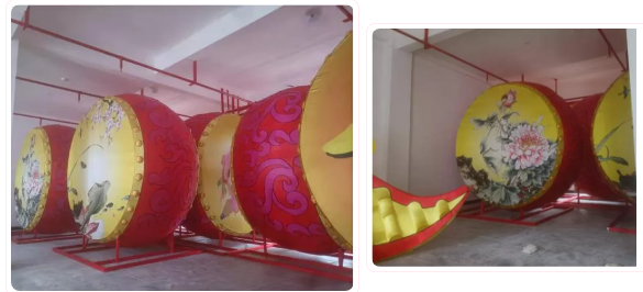 現(xiàn)場(chǎng)大多數(shù)的花燈還在按流程趕制中,也有一些已成型了。已經(jīng)制作好的打鼓你能看出是哪一個(gè)花燈造型的嗎?
